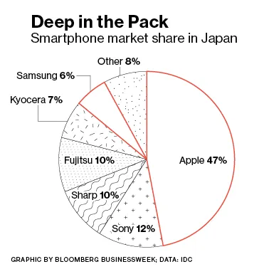全球出货的智能手机中有五分之一是三星的,但在这个第三大经济体中,很难找到一部。根据研究机构IDC的数据,三星在日本的3600万部手机市场中仅占6%,而苹果接近50%。在全球范围内,这家韩国公司仍然领先于苹果,但在日本却落后于夏普、富士通和京瓷等本土品牌。