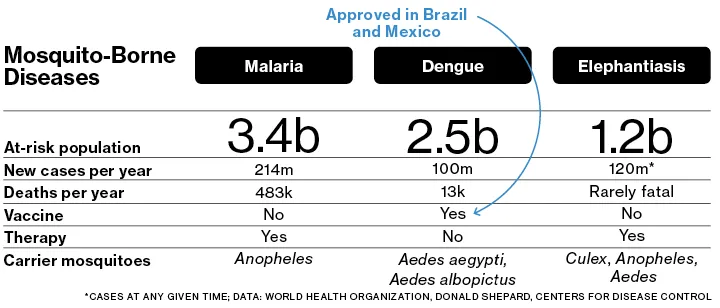 2015年全球有2.14亿例疟疾病例和438,000例死亡,而登革热约有13,000例。根据盖茨基金会和非营利组织“无疟疾”的一份报告,到2040年消除疟疾的成本将为900亿美元至1200亿美元,而从健康和生产力收益中将获得2万亿美元的收益。计划是部署疫苗并消除按蚊。