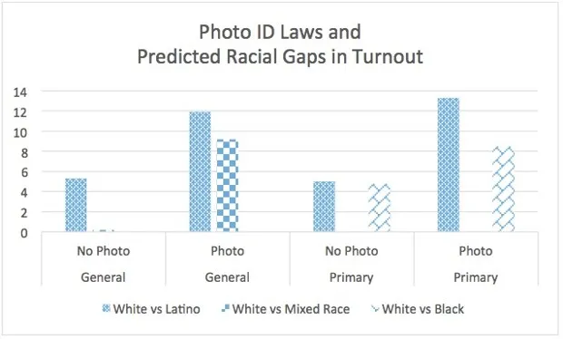 他们的研究显示了在有和没有选民身份证要求的州之间,投票率的种族差距有多大。查看2008年至2012年的一般选举结果,研究人员发现,在需要照片身份证投票的州,拉丁裔的投票率比在不需要的州低10.3个百分点。对于初选,他们发现,严格的照片选民身份证法律使拉丁裔的投票率比在非选民身份证州低6.3个百分点,并使非裔美国人的投票率低1.6个百分点。