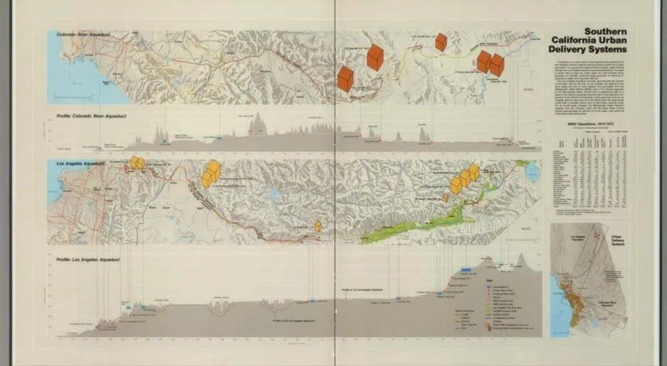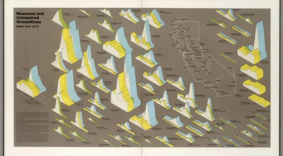 图片扫描由大卫·拉姆齐地图收藏提供。“这是一本具有里程碑意义的地图集,首次全面展示加利福尼亚州广泛的水系统在地理背景下的情况。它很庞大,有数百张地图和图表,以不同的方式讲述加利福尼亚的水故事。我常常说,试图将你拥有的每一条信息都塞进一张地图或可视化中是个错误;这个项目完美地证明了这一点。”