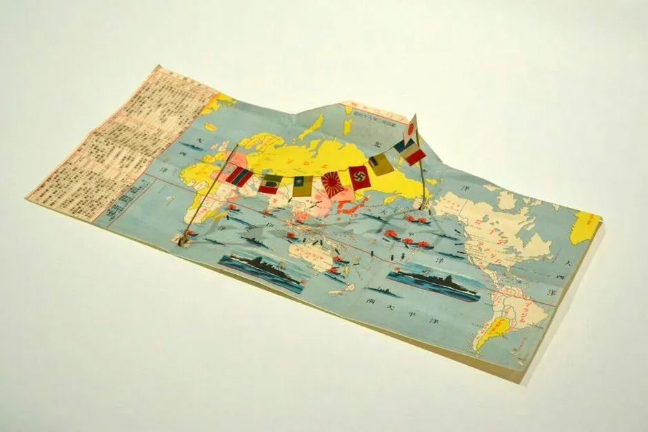 感谢大卫·拉姆齐地图收藏。照片由亚历克斯·凯因提供。“这是1940年代发行的一张纪念明信片,用于‘庆祝’日本对珍珠港的攻击。在这张地图中,夏威夷群岛被爆炸的船只和飞机包围。当你打开它时,一对旗杆会弹出,旗杆之间悬挂着轴心国的旗帜,包括纳粹旗。”