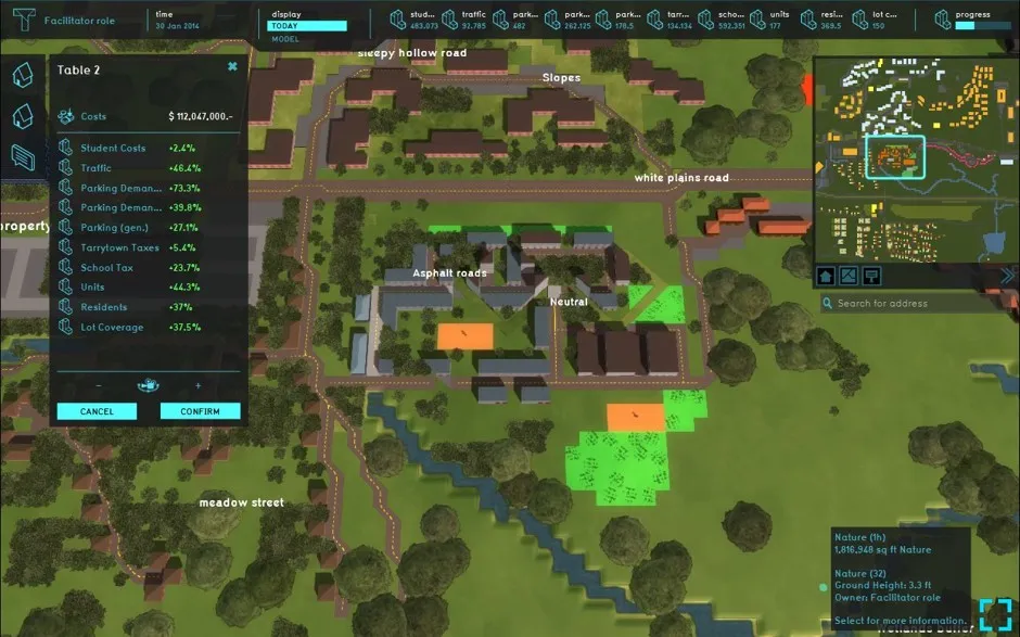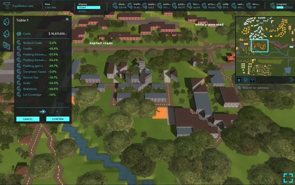 设计练习的塔里敦会议的静态图由Tygron提供威廉·莫里什,一位长期从事城市设计的专家,曾在新奥尔良和下曼哈顿参与重建方案,解释了游戏的起源。他与精英律师事务所Debevioise和Plimpton的合伙人詹姆斯·E·约翰逊种下了这个种子,约翰逊是法院指定的监督员。