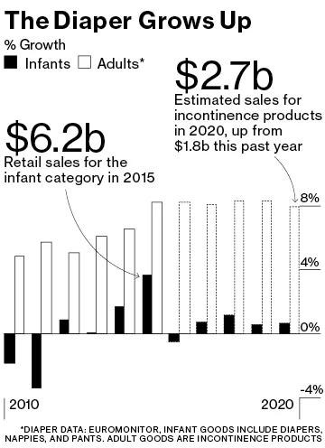底线: 预计成人失禁产品的销售将在2015年至2020年间增长48%。婴儿尿布的销售将增长2.6%。