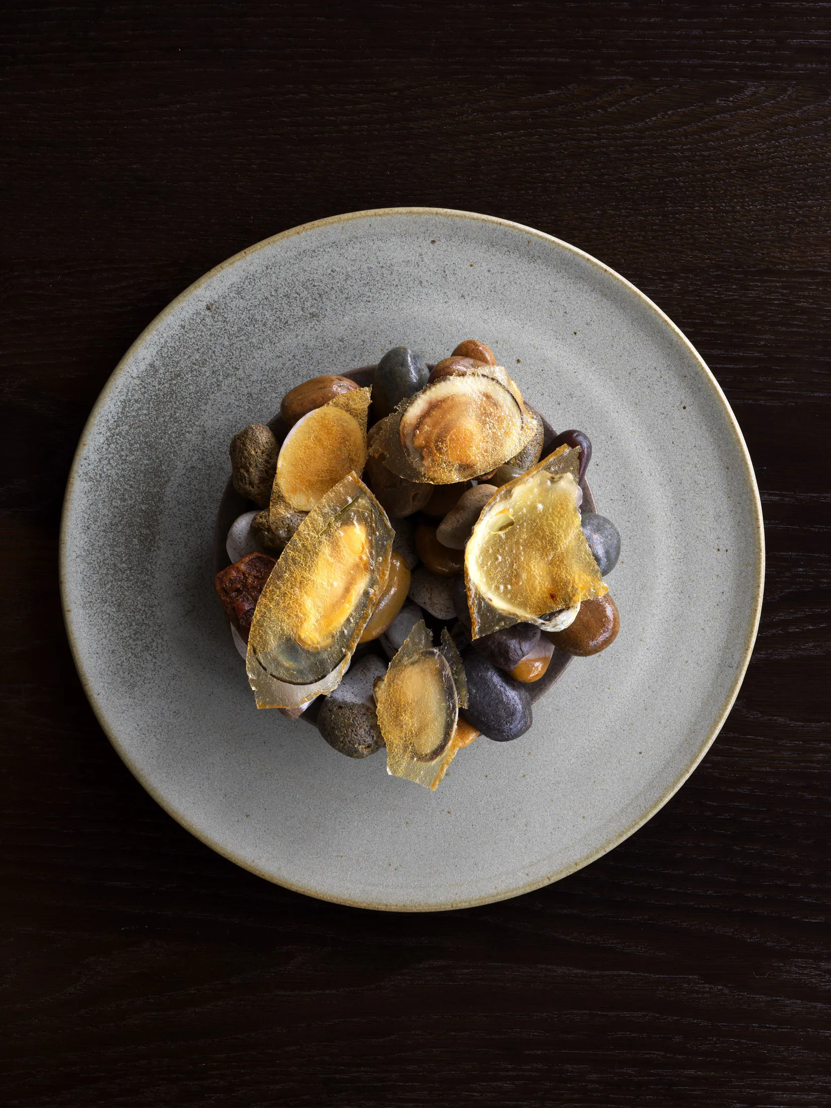 当该地区在1980年被清理以进行新开发时,离Noma的厨师们为贝类菜肴打开生蚝的地方不远,发现了一个土著露营地,里面有一个贝壳档案:海蛎、岩石和泥蚝、海螺、毛蚶。Noma的贝类菜肴是一种简约的致敬。为了制作它,Redzepi使用鳄鱼脂肪来固化在鸡肉高汤表面形成的薄薄的晶体膜,然后将一些覆盖在每个半贝壳上。结果是在咸味、半透明的金色面纱下,贝类的光滑隆起,松弛并粘在你的牙齿上。当你抓到一只银色的贻贝或一只肥美的生蚝时,真是美妙,但有一只蛤蜊的味道如此浓烈和苦涩,以至于我害怕自己可能无法将其吞下。我想,对于在深水中生长的动物,也许我们并不总是注定要找到它们,更不用说将它们带回陆地,撬开它们,生吃并涂上鳄鱼脂肪了。