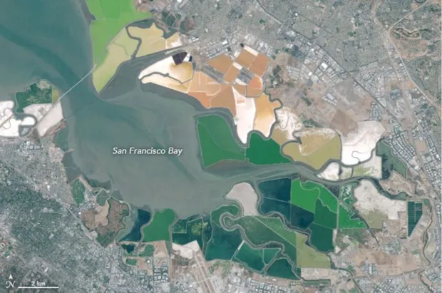 美国国家航空航天局/美国地质调查局飞越旧金山湾的南指,你会遇到一个奇异的景象:广阔的色彩鲜艳的水池,有些像火星土壤一样生锈,另一些则深红如屠宰场的血液。