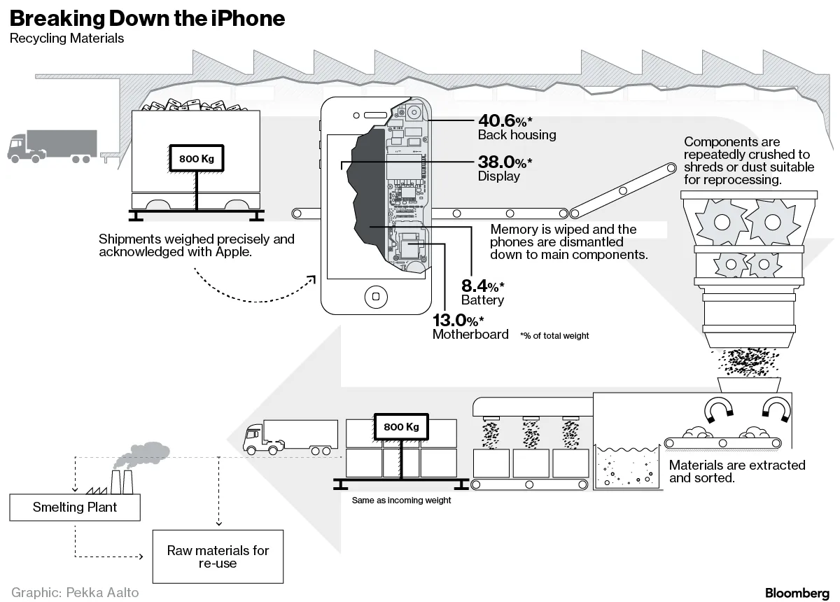 一旦它被粉碎,你的旧iPhone会变成什么?有害废物会存放在一个有执照的设施中,回收合作伙伴可以从其他提取的材料如黄金和铜中获得佣金。其余的则被再生为铝窗框和家具,或玻璃砖。