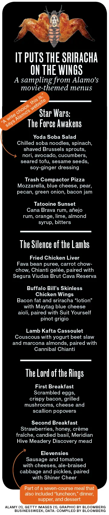 随着预映娱乐的进行,身穿黑衣的服务员开始接受餐点订单。标准菜单提供一系列小吃(无限量爆米花、烤蒜鹰嘴豆泥)、热食(布法罗鸡肉披萨、三重猪肉汉堡)、沙拉、啤酒、葡萄酒和鸡尾酒(包括“成人奶昔”,如Maker’s Mark牛奶冲击)。顾客可以在电影中途通过在纸上写下订单并夹在座位前的桌子上来点更多的食物或饮料。Drafthouse定期推出为特定电影构思的特色食品和鸡尾酒创意。League表示,受电影启发的美食往往能刺激食品和酒精的销售,并在社交媒体上引发热议。