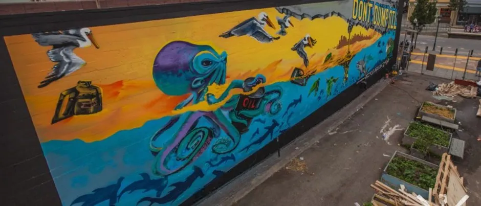 这幅长达100英尺的壁画位于湾景-猎人角社区的一面墙上,出于某种原因,这里长期以来一直是非法倾倒石油的热门地点。在画中,一根管子将黄色、看起来有毒的液体滴入旧金山湾,而鲨鱼、海龟、鹈鹕和一只章鱼则厌恶地看着。如果信息还不够明确,还有文字在大喊“不要倾倒油。”