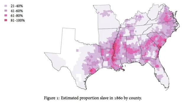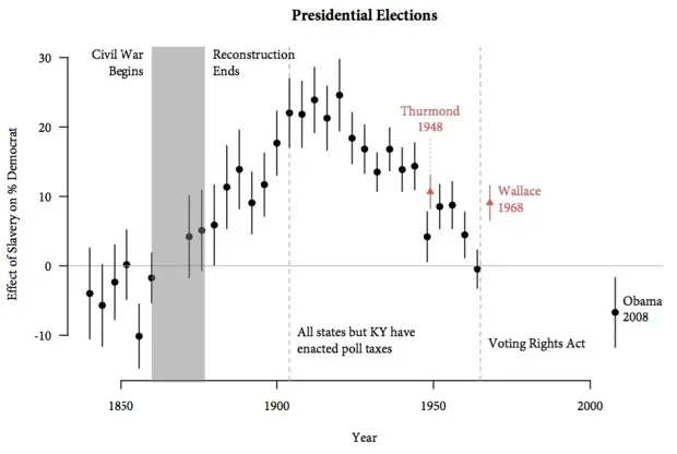 利用1860年人口普查数据结合来自包括 合作国会选举研究(CCES)在内的更近期数据,研究人员绘制了自奴隶制结束以来南方的政治活动。他们发现,在南北战争之前拥有更高奴隶人口的县,如今由更可能反对基于种族的政策(如平权行动)的白人选民所居住。这使得这些地区的白人选民在从重建到1968年乔治·华莱士的总统候选人中,持续投票支持持有种族主义立场的候选人。这可能解释了特朗普今天在南方的胜利。