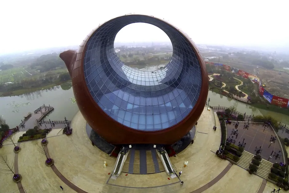 在江苏省无锡市,可以看到一个形状像陶土茶壶的建筑的鸟瞰图。路透社/卡洛斯·巴里中国一些最引人注目的建筑只能被描述为“奇怪”:一个以传统神灵为形状的酒店,一个茶壶形状的信息中心,当然还有被称为“大裤子”的央视大楼。还有在中国长期流行的 模仿建筑,包括狮身人面像、埃菲尔铁塔,甚至白宫的复制品。
