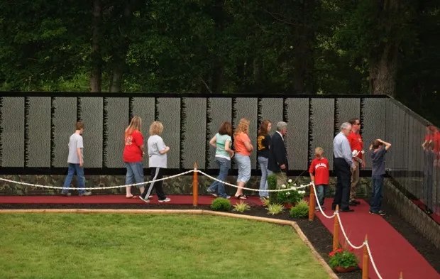 2011年在田纳西州卡姆登的移动墙。越南战斗老兵/移动墙一些社区不愿意满足于一个旅行复制品,因此他们建造了永久的仿制品。伊利诺伊州纳珀维尔的荣誉疗愈场的游客在11月开放时将其新的越南老兵纪念墙——林的原始设计的全尺寸复制品——形容为 “神圣的土地”。为 南俄勒冈州的越南老兵纪念墙复制品的规划者们在中央点附近的地点上意见不一。佛罗里达州 彭萨科拉、 新泽西州野木以及其他城市都有现存的复制纪念碑。