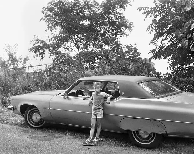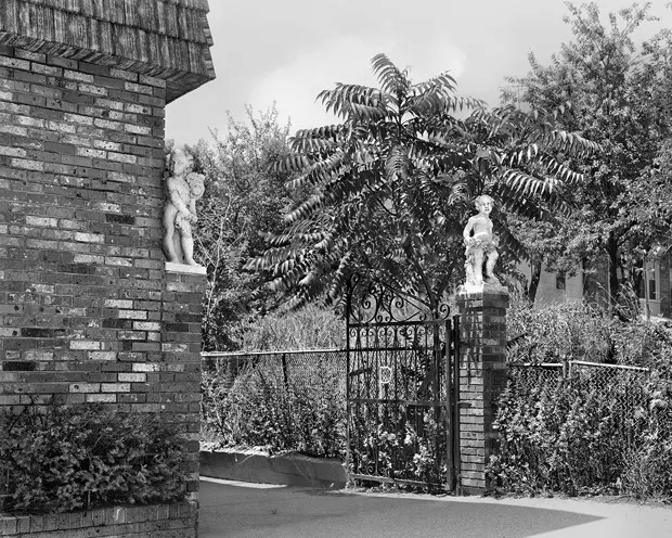 普提和门。克里斯汀·奥辛斯基在一张图片中,杂草丛生的草坪穿过铁丝网围栏,而肥胖的普提站在邻居家的砖柱上。在另一张图片中,两个小男孩懒洋洋地靠在停在车道或道路旁的汽车上,视线中没有一栋房子。