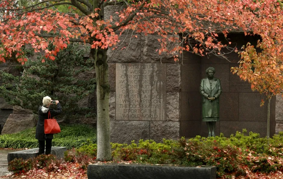 位于华盛顿特区富兰克林·德拉诺·罗斯福纪念馆的埃莉诺·罗斯福雕像。凯文·拉马奎/路透社女性雕像从来没有名字。她们是原型、象征、缪斯、力量。自由女神像。自由雕像。昼与夜。三位优雅女神。女性在纪念碑中随处可见,作为受害者、精神、沉思、神化的象征——但几乎从未作为有真实历史的女性,带着名字。