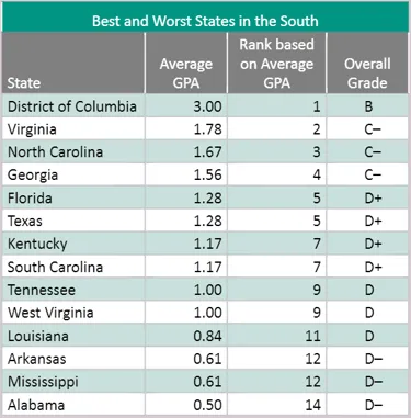 为了比较全国女性的地位,该报告根据六个类别对每个州进行评分:政治参与、就业和收入、工作与家庭、贫困与机会、生育权和健康与福祉。没有一个南方州的总体评分高于C-。事实上,14个南方州中有10个获得了某种形式的D等级,如下图所示。