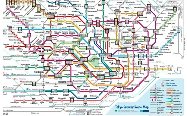 完整的东京地铁地图。东京地铁尽管色彩斑斓、狂热辉煌,东京地铁地图并不是世界上最复杂的地铁指南。纽约和巴黎在这方面都更胜一筹——至少在一组理论物理学家和数学家的眼中。