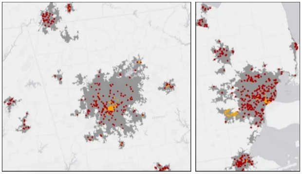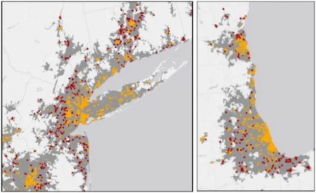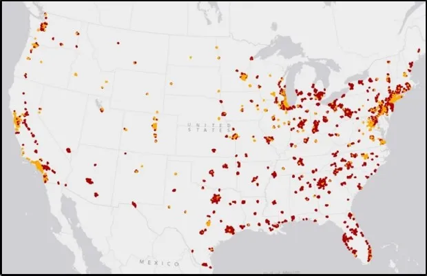 利用关于18,300个HUD物业的信息,覆盖15个大都市地区,研究人员绘制了全国可负担住房的全景图。在下面的地图中,较昂贵的可负担住房用红色标出。在这些地方,交通费用超过当地典型低收入家庭年收入的15%。这意味着住房加上交通费用占家庭年收入的45%以上。最可负担的住房用橙色标出,交通费用低于15%的阈值。