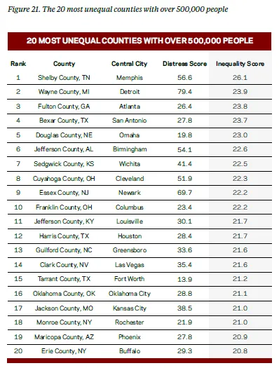 下一个表格显示了美国前20个最不平等的县。这份名单主要由包括亚特兰大、伯明翰、休斯顿和沃斯堡等城市的南方县组成,以及底特律、克利夫兰和俄亥俄州的哥伦布等铁锈带城市的县。