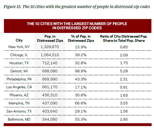 下表显示了居住在困扰邮政编码中人数最多的十个美国城市。考虑到其庞大的人口规模,纽约以超过130万居民居住在困扰邮政编码中而位居第一,这大约占其人口的16%。芝加哥以超过100万居民居住在困扰邮政编码中排名第二(占其人口的39%),随后是休斯顿,超过70万居民(占其人口的33%)。其余的前十名包括底特律、费城和洛杉矶等大型城市。