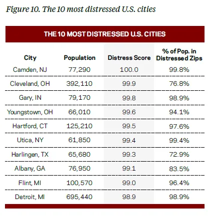 下表列出了全国前10个最困扰的城市。正如人们所预期的,报告再次发现“东北和中西部的挣扎中的铁锈带城市登记了最高的经济困扰水平。”新泽西州的卡姆登以100的困扰分数位居第一,紧随其后的是俄亥俄州的克利夫兰、印第安纳州的加里和俄亥俄州的扬斯敦。哈特福德、尤蒂卡和德克萨斯州的哈林根占据了接下来的三个位置,而阿尔巴尼、弗林特和底特律等城市则位列前十。这10个城市的困扰分数均超过98。