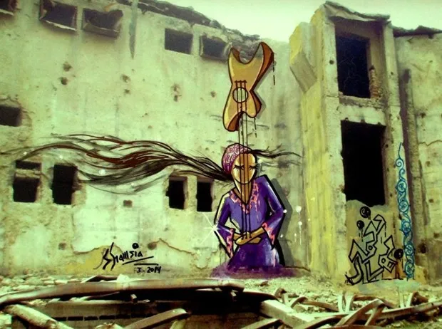 Shamsia Hassani与她的“曾几何时”系列壁画。Facebook / Shamsia Hassani在喀布尔的边缘,沿着一条穿过城市的漫长尘土飞扬的道路,达鲁阿曼宫的废墟空荡荡地矗立着,满是炮弹的痕迹。这座建筑曾是对新古典主义建筑的美丽致敬,如今大多成为战争撕裂城市的又一提醒。