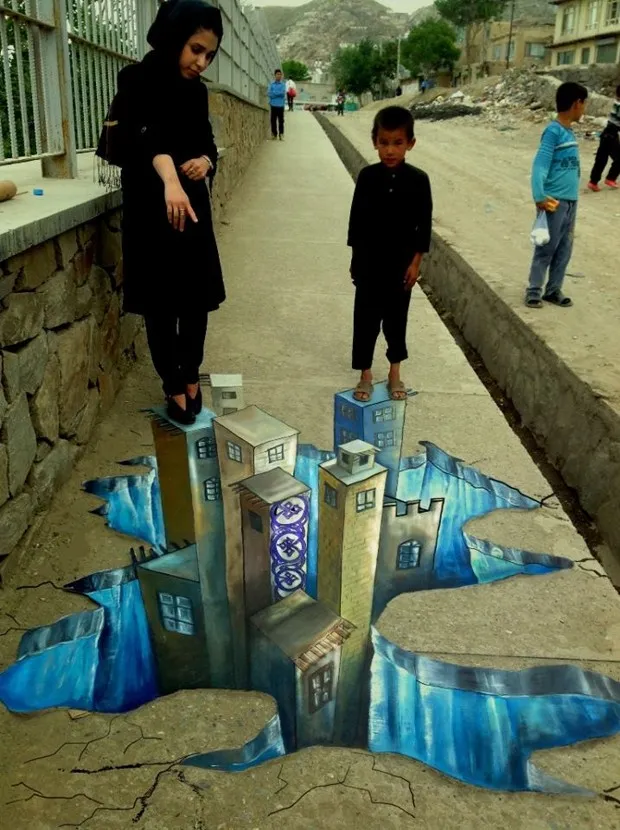 Shamsia Hassani向一个小男孩展示她的人行道画作。Facebook/Shamsia Hassani