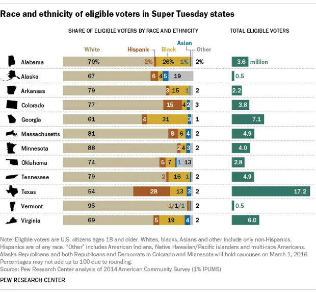 这里最大的收获是,南方州的大量黑人群体将在周二民主党的党团会议和初选结果中发挥巨大作用。在12个州中,有5个州的黑人选民占选民的至少15%。乔治亚州以31%的黑人选民位居榜首,其次是阿拉巴马州(26%)、维吉尼亚州(19%)、田纳西州(16%)和阿肯色州(15%)。