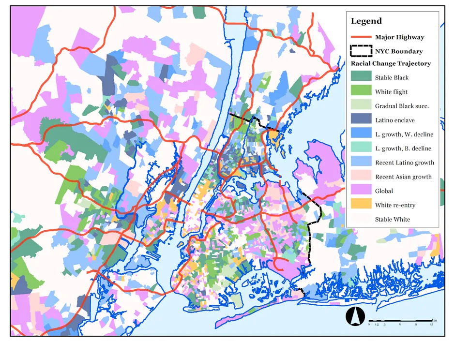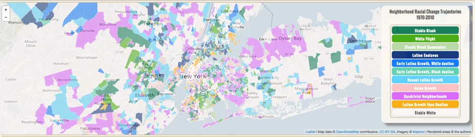 “早期拉丁裔增长,黑人减少” (青色):这些最初是黑人社区,在1980年后几十年里拉丁裔居民增长。