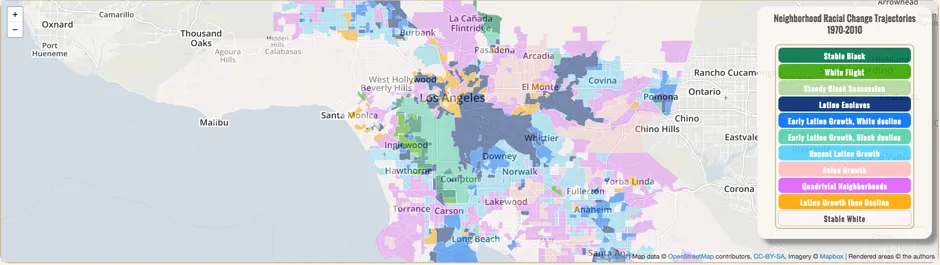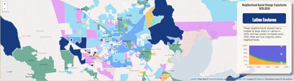 **“拉丁裔增长,然后减少” (橙色):**这些在1980年代类似于拉丁裔飞地。在1990年代和2000年代,这些社区的白人比例增加,拉丁裔比例减少。