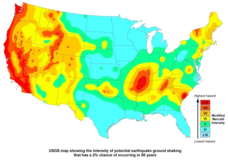 如果这样的地震发生,联邦应急管理局预测将有近13,000条生命面临危险。下面的地图显示了在这50年时间跨度内全国各地区的潜在危险。请注意西海岸令人恐惧的红色区域,这对应于 梅卡利地震强度等级的九级或以上——这是暴力到极端破坏的指标。