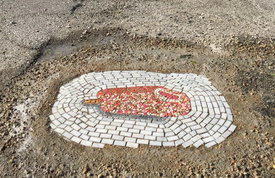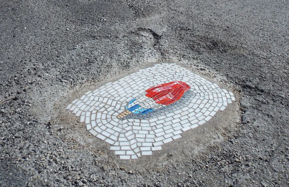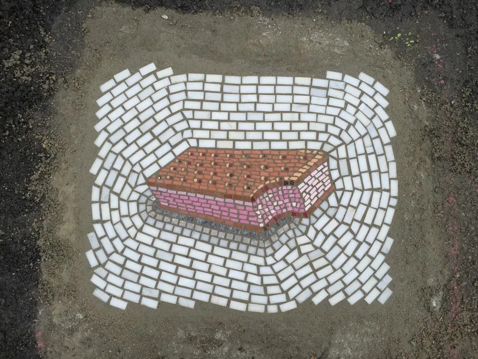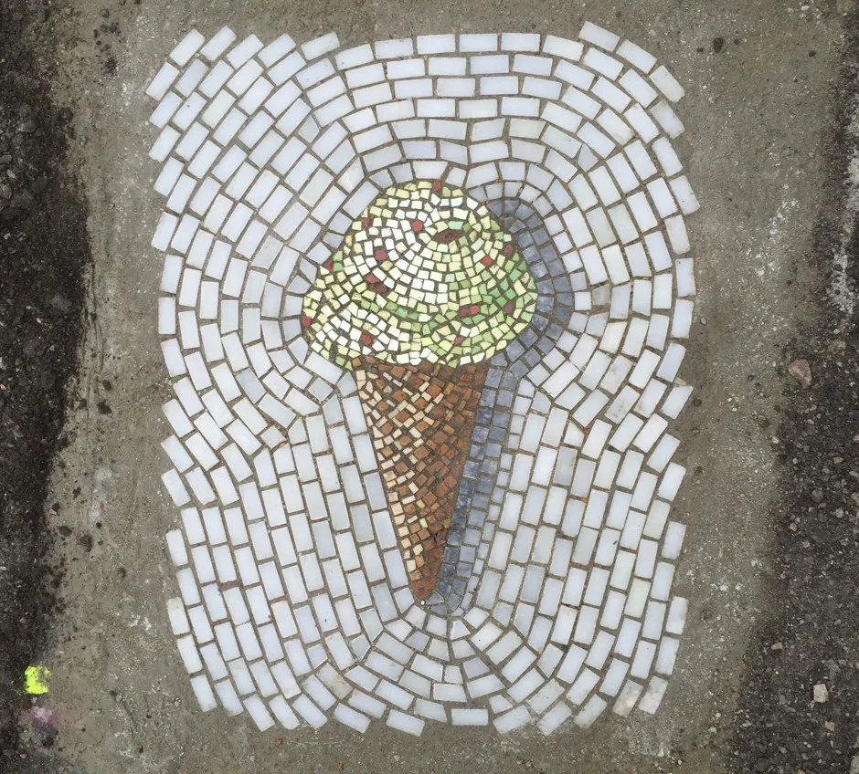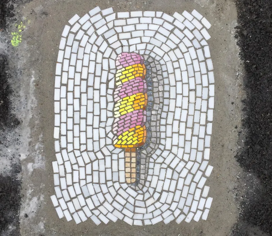 芝加哥人可能以前见过巴乔尔,也许是在一个橙色背心中弯腰修补坑洼,周围环绕着橙色交通锥。这是因为自2013年以来,巴乔尔一直在各个社区之间移动,用大理石和玻璃马赛克填补坑洼,反映出一种干涩的幽默。“这不是一个坑洼,”他的一件作品上写道,位于芝加哥市中心。在某些地方,他创作了序列号的马赛克,以嘲讽城市中坑洼的数量。他最近的一系列作品,来自2015年,围绕“街头美食”的主题,安装了经典冷冻美食的坑洼马赛克。
