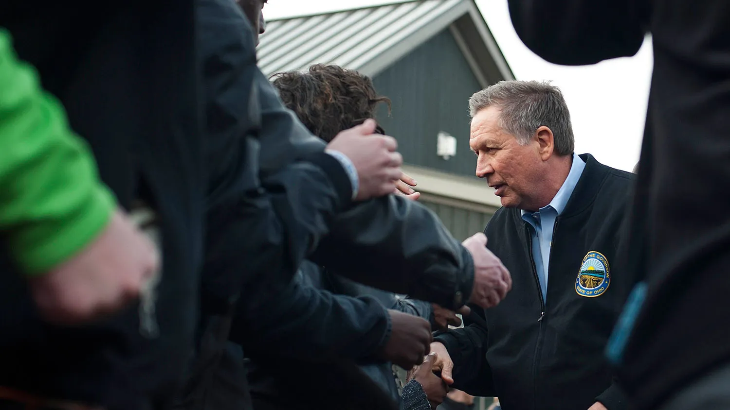 俄亥俄州州长约翰·凯西奇在2016年3月6日于俄亥俄州哥伦布市的竞选集会上发言后与人群中的与会者握手。