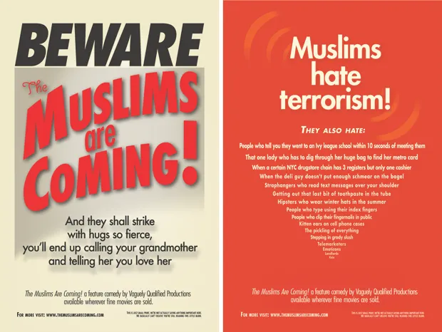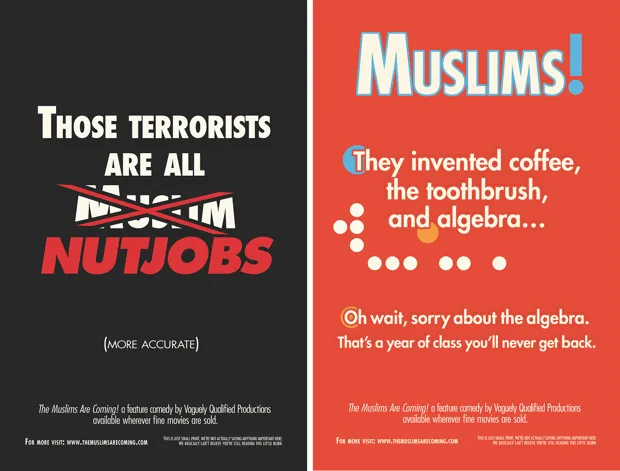 这对搭档将该声明和其他五个声明制作成广告,早些时候在纽约市地铁中张贴,以宣传法萨德和奥贝达拉的纪录片《穆斯林来了。” 事实上,这一声明在其中一则广告上赫然醒目。“小心,穆斯林来了!”广告上用大红字写道。“他们将以如此强烈的拥抱袭来,你会打电话给你的祖母,告诉她你爱她。”