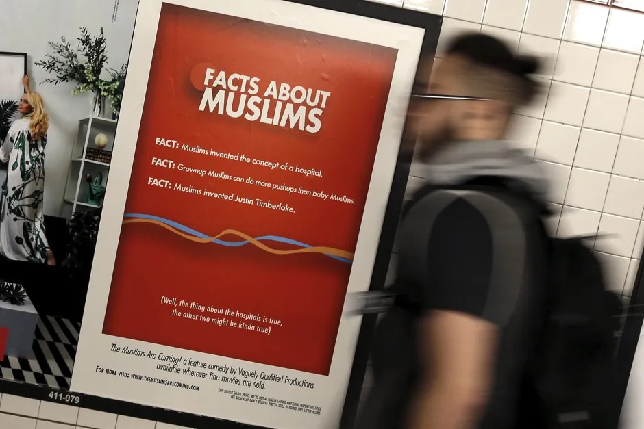 一名男子在曼哈顿市政厅地铁站内经过一张宣传新纪录片《穆斯林来了》的海报。路透社/迈克·塞加尔这是一个丑陋的真相:“穆斯林有很棒的煎蛋饼食谱。”