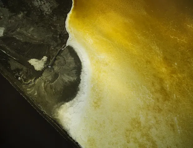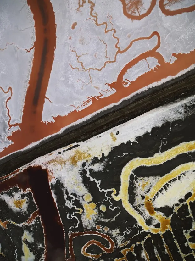 “BaySalt_6416”托马斯·海因塞特展览包括旧金山国际机场附近蒸发池的照片,150年的盐制造将大片湿地变成了鲜艳的红色和黄色花朵。还有中央谷的照片,曾经郁郁葱葱的田野因多年干旱而变成了棕色的伤疤。还有去年秋天历史性野火在湖县造成的可怕破坏的影像。
