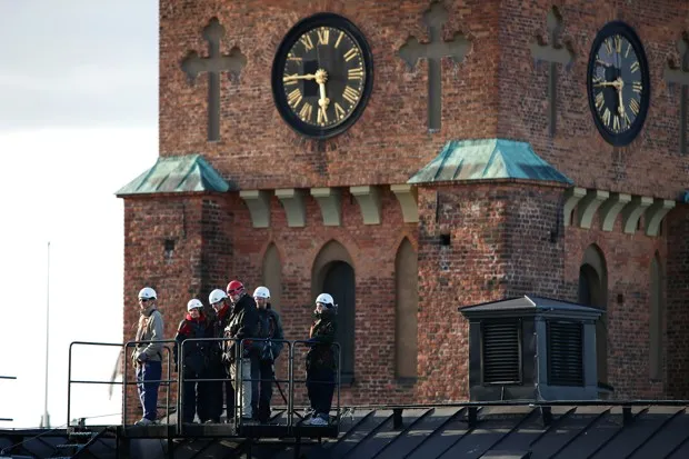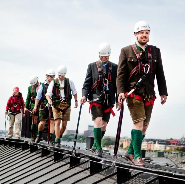 一位导游带领一些勇敢的游客穿越斯德哥尔摩旧议会大楼的屋顶。Takvandring Sverige AB在旧议会大楼的屋顶上,没有任何可以抓住的栏杆,屋顶高出斯德哥尔摩街道140英尺。但这并没有阻止人们通过一间律师事务所的梯子爬上去,走到面向天空的表面。