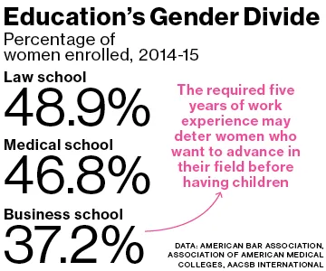 “如果我们决定让女性直接从大学进入[商学院]并降低这个门槛,毫无疑问我们会吸引更多女性,”爱荷华大学蒂皮商学院的院长莎拉·费舍尔·加迪尔说。但代价是什么呢?她和其他一些院长认为,授予年轻学生学位会降低其价值。他们表示,学生在课堂上每个人都带着自己的工作经历时,学习效果更好。费舍尔·加迪尔说:“你确实是在建立一个更丰富的教育过程,因为参与者从同学那里学到更多。”