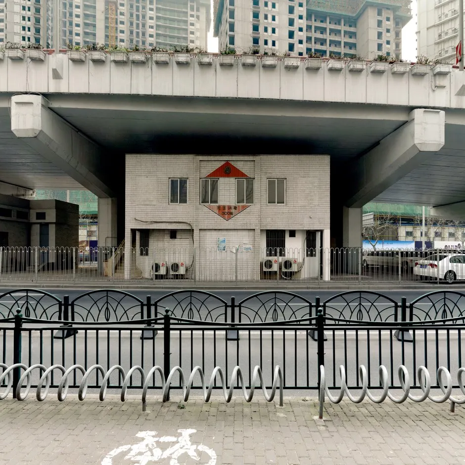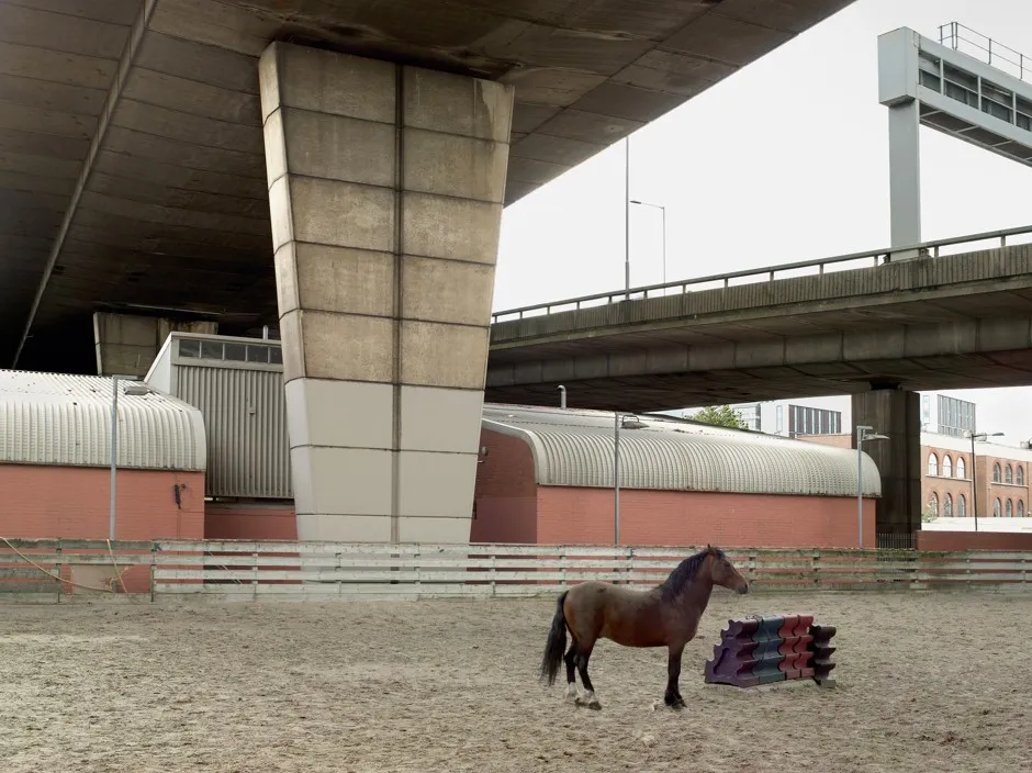 一匹马在英国伦敦的一个立交桥下训练。吉塞拉·埃尔拉赫 2011年,摄影师吉塞拉·埃尔拉赫访问了中国重庆市,并对城市的“地下空间”产生了浓厚的兴趣——这些小而不太可能的生活角落夹在高耸的巨型建筑物之间或藏在它们下面,如高速公路和桥梁。她以前见过这些。在她位于奥地利维也纳的家附近,有一座小房子,屋顶距离两条巨大的高速公路仅几英尺。