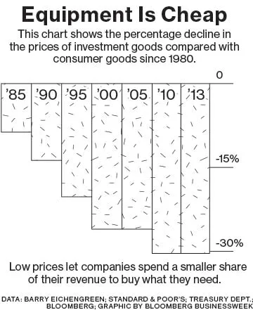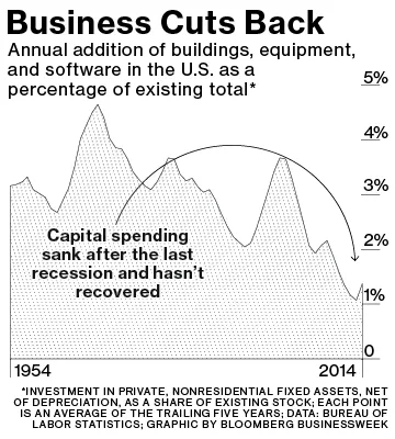 放大镜下的图表显示,公司以历史上缓慢的速度增加国家资本存量。在另一项计算中,美国劳工统计局表示,它所称的“资本密集度”——资本使用与工作小时的比率——如此疲弱,以至于在2010年至2014年间实际上削弱了工人的生产力。