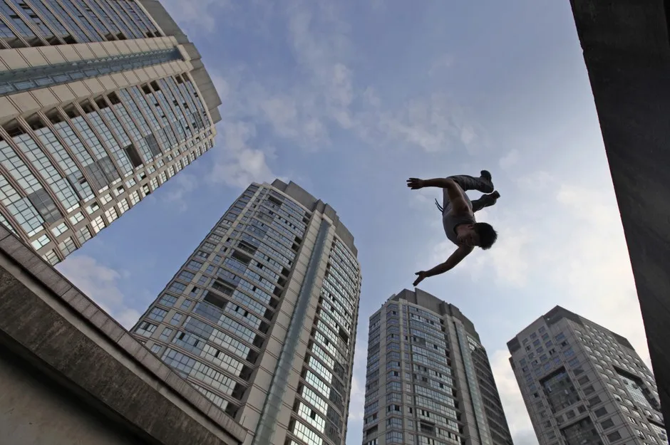 一名年轻人在浙江省台州市一栋七层楼的建筑上进行跑酷练习。路透社/记者用#CityReads给我们发推你的最爱。