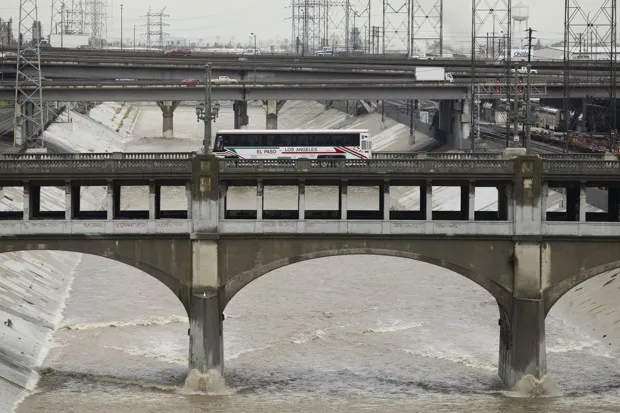 交通穿过洛杉矶河上的桥梁。美联社照片/达米安·多瓦尔根斯,档案