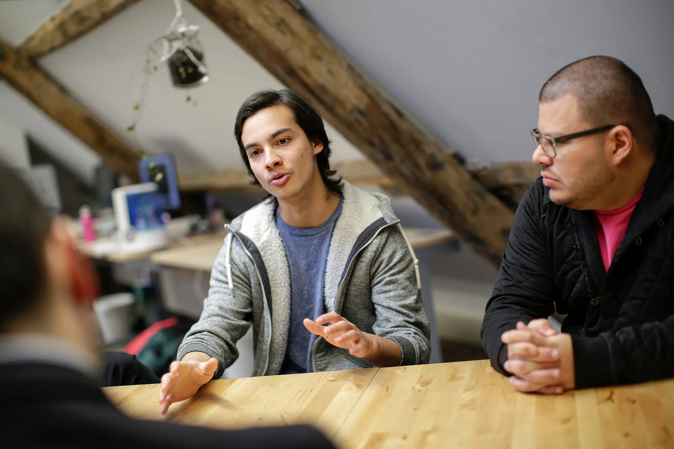 Leaf.fm的联合创始人丹尼尔·萨拉斯(Daniel Salas)左侧在纽卡斯尔总部接受采访时手势表达,Leaf.fm的首席执行官吉尔伯特·科拉莱斯(Gilbert Corrales)在一旁观看摄影师:马修·劳埃德(Matthew Lloyd)### 为什么选择纽卡斯尔?