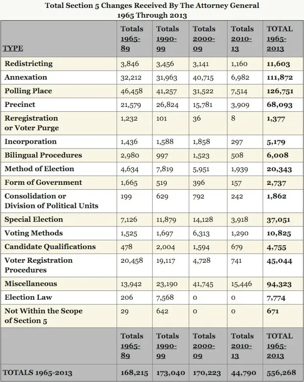 联邦政府审查了超过126,000个请求,这些请求来自寻求在1965年至2013年间进行类似投票地点更改的辖区。这是迄今为止,依据第5条款的地方提出的最高请求,其中大多数并未被拒绝。然而,这些投票地点更改的频率在某种程度上表明,在有色人种集中地区,这种情况被考虑的频率有多高。但在2013年,美国最高法院无效化了用于确定哪些辖区需要预先批准的公式。