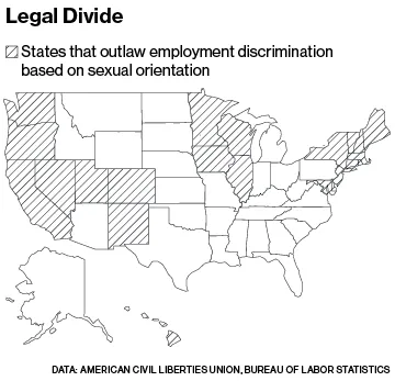 反同性恋歧视在28个州是合法的,约占54%的工人,根据美国劳工统计局的数据。LGBT工人面临的不仅仅是缺乏保护;根据人权运动(HRC)的说法,今年在33个州有200项法案正在考虑,这些法案被认为可能对同性恋和跨性别者不利,HRC致力于促进LGBT平等。