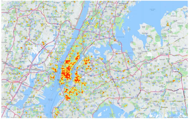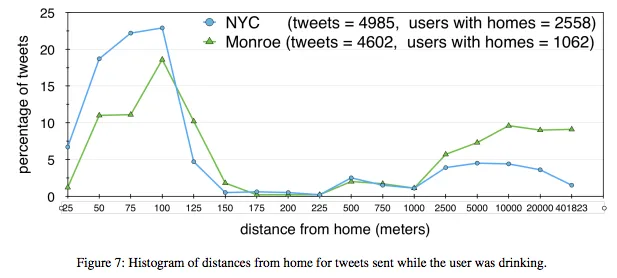 结果呢?即使纽约市有大量的酒吧、音乐场所和俱乐部,人们实际上更可能在家里饮酒。前往饮酒的纽约人并没有走得太远:他们大约在HQ周围125米内活动。然而,位于门罗周围的人更可能在离家开车可达的范围内发关于饮酒的推文。