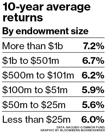 尽管发生了这种转变,但大型捐赠基金(如耶鲁的)与较小捐赠基金之间仍然存在持续的长期表现差距。拥有至少10亿美元基金的学校在过去十年中年均收益为7.2%,而从1.01亿到5亿的学校平均为6.2%。国家大学与学院商业官员协会的研究与政策分析主任肯·雷德表示:“十年间的一个百分点差异是相当可观的。”对于一个起始资金为2亿美元的捐赠基金,这一差异在这段时间内累计达到3600万美元。
