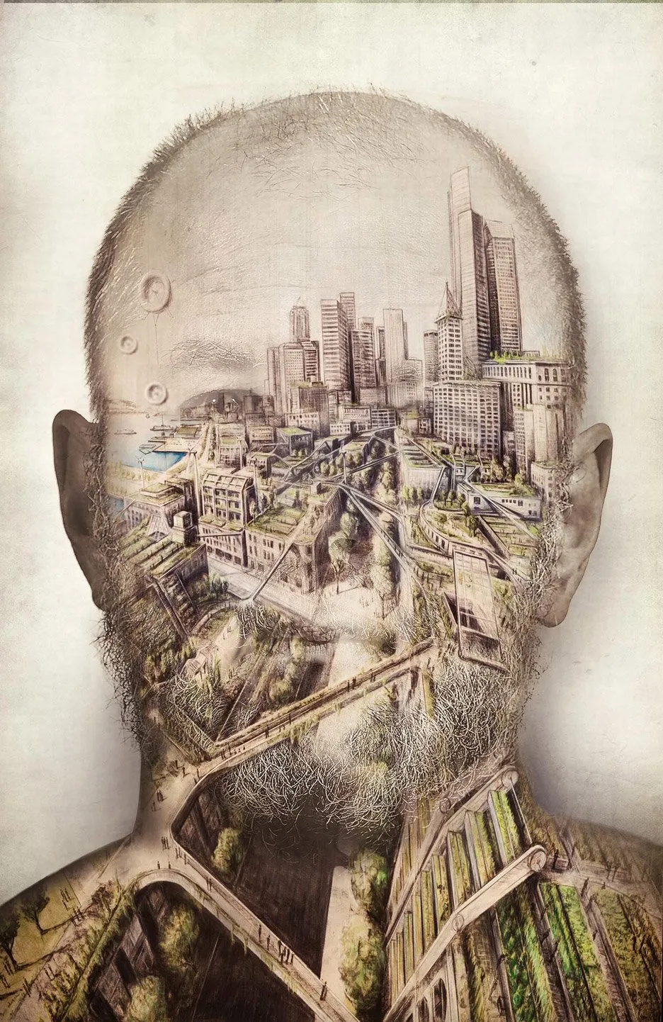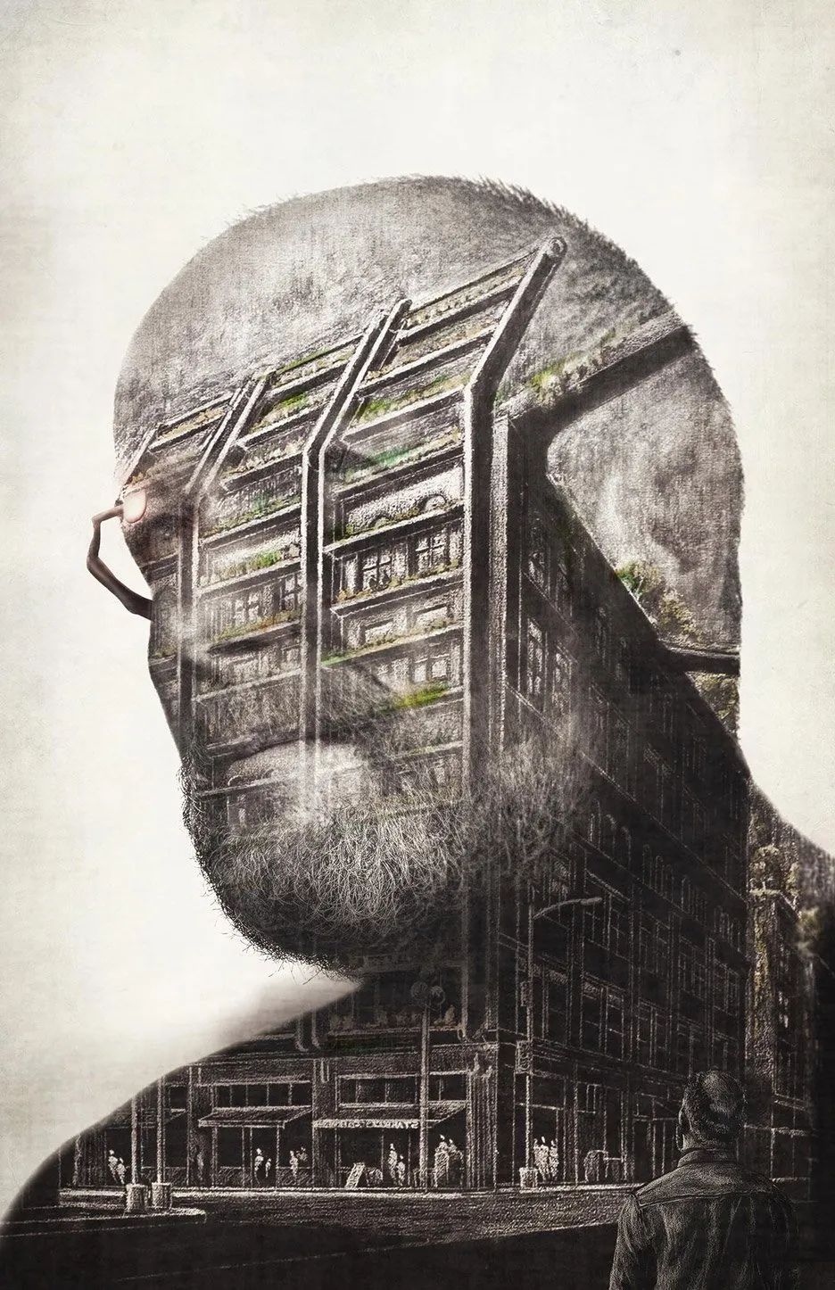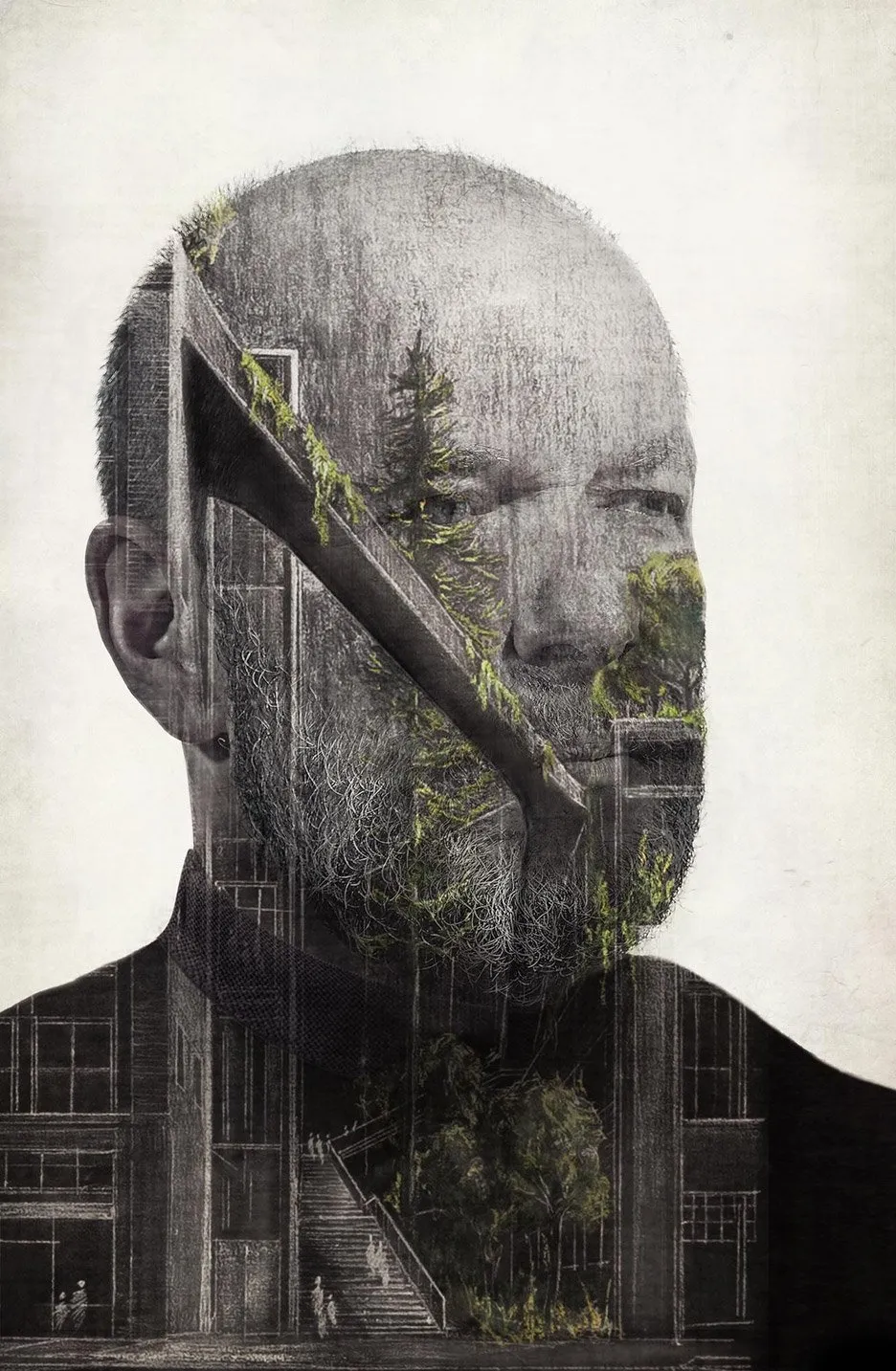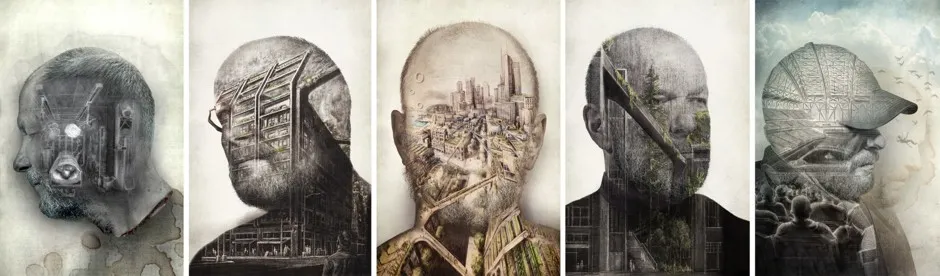 这些画作,超现实主义的肖像,将自然与形式融合,似乎得出了同样极其人性的结论:设计可以让世界变得更美好,即使这是我们不配拥有的。这些画作并不是故事板插图。相反——部分是雷内·马格里特,部分是M.C.埃舍尔——它们回响着故事。自画像将作者/叙述者塑造成一个悲剧英雄。这在这个领域并不罕见。