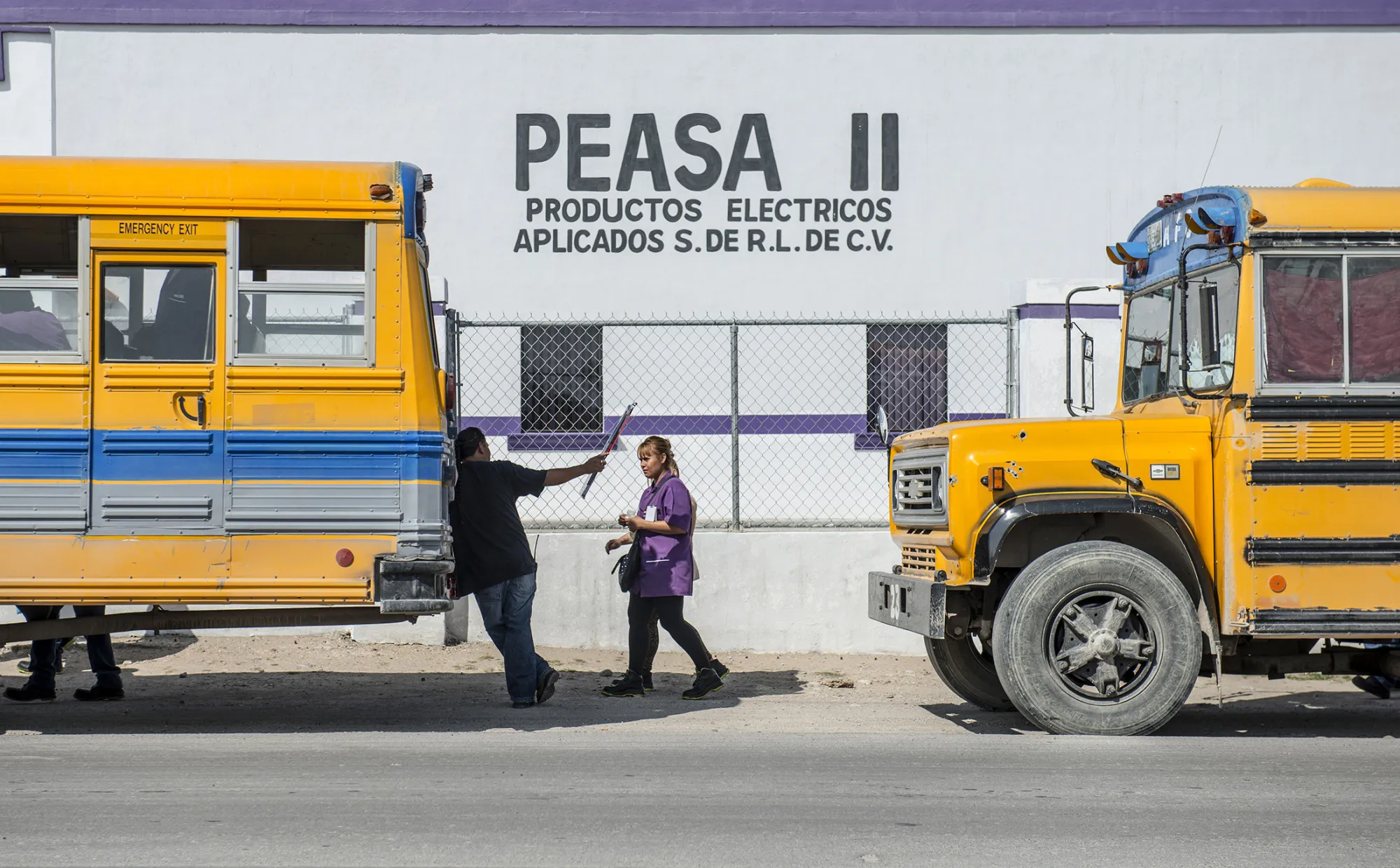 在墨西哥阿库纳,Regal Beloit Corp.工厂的工人们走向将他们送回家的公交车,结束了他们的班次。
