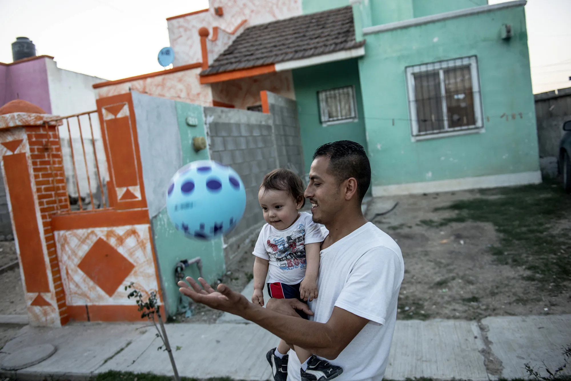 曼努埃尔·阿拉贡在墨西哥阿库纳和他一岁的儿子玩耍。