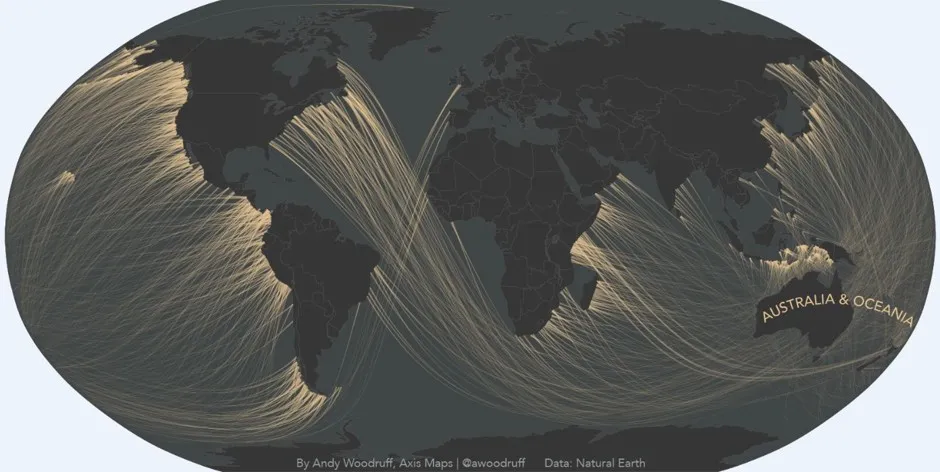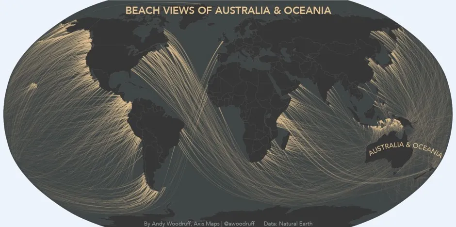 好吧,如果你恰好在南卡罗来纳州到纽芬兰的某些地方,你的视线可能会一直指向澳大利亚。这在这些 来自制图师安迪·伍德拉夫的新奇地图中显而易见,他为每个大陆的海岸绘制了虚拟的“视线”。