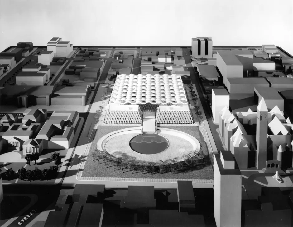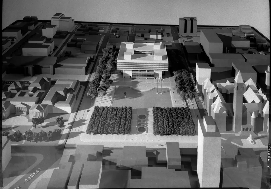然而,雷维尔从未看到他的模型变为现实。在盛大开幕前一年,这位54岁的设计师因心脏病发作去世。从那时起,这个公共广场就成为了当地抗议和庆祝活动的事实聚集地。在国际上,这座城市作为热门拍摄地点的崛起,使市政厅获得了比1958年任何人预期的更多电视和电影客串。